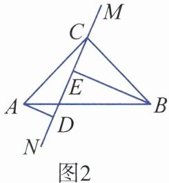 [图形描述:直线MN与AB相交,交点靠近B,D在AC左侧,E在BC右侧]