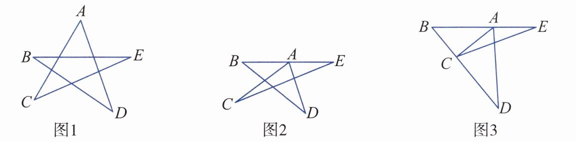 例4 如图。(1)图1是一个五角星,求∠A+∠B+∠C+∠D+∠E的度数。(2)将图1中的点A向下移到BE上(如图2),五个角的和有无变化?说明理由。(3)将图2中的点C向上移到BD上(如图3),五个角的和有无变化?说明理由。