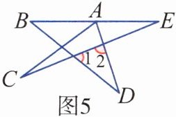 (2)不变,仍为180°,如图5,同(1)可证∠CAD+∠C= ∠2,∠B+∠E= ∠1,∴∠CAD+∠B+∠C+∠D+∠E= ∠1+∠2+∠D= 180°。