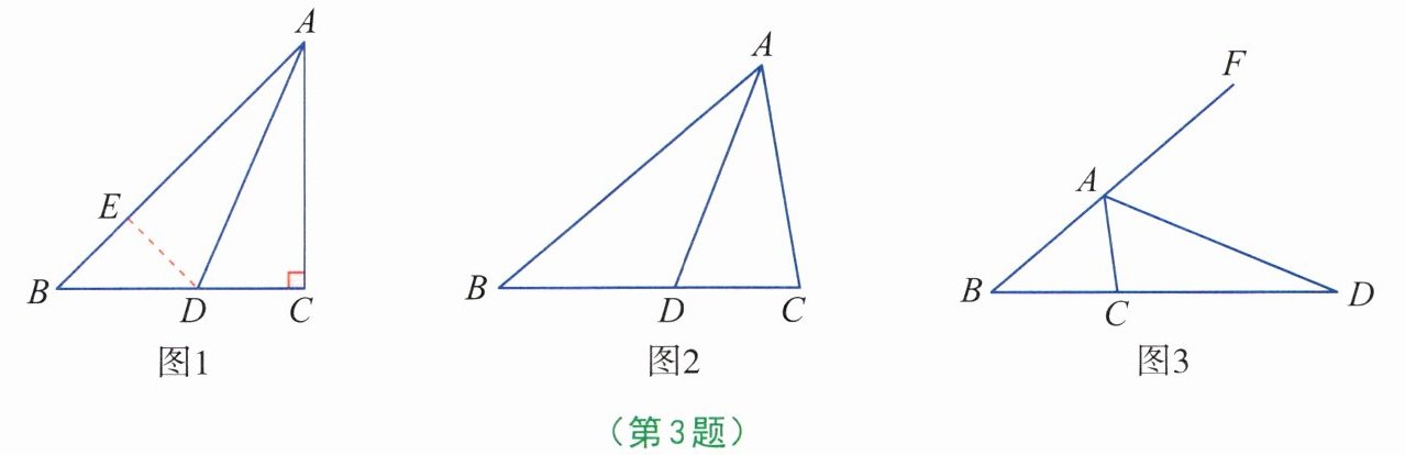 (2)如图3,当AD为△ABC的外角平分线时,线段AB,AC,CD又有怎样的数量关系?请写出你的猜想,并给予证明。