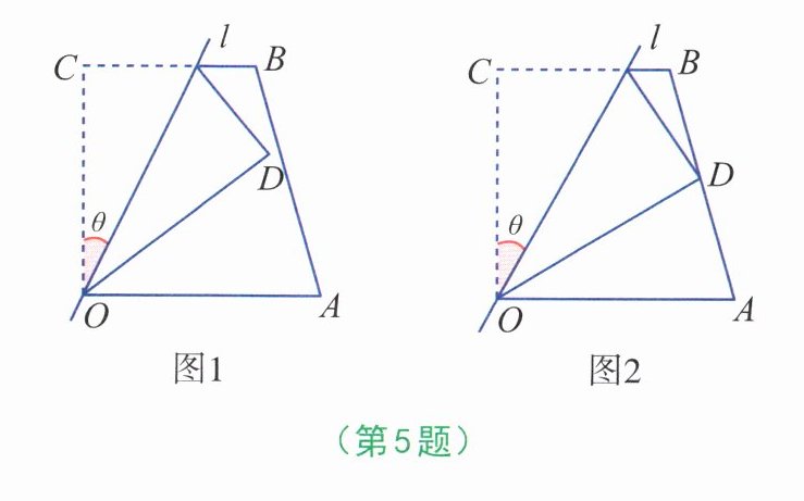 5. 如图1,在四边形OABC中,OA= a,OC= 8,∠AOC= ∠BCO= 90°,经过点O的直线l将四边形分成两部分,直线l与OC所成的角设为θ,将四边形OABC的直角∠OCB沿直线l折叠,点C落在点D处。