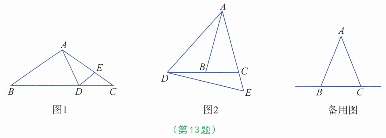 13.如图,在△ABC中,∠ABC= ∠ACB,点D在BC所在的直线上,点E在射线AC上,且AD= AE,连结DE。