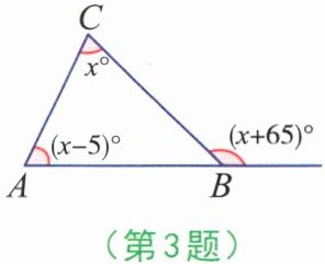 3. 在△ABC中,∠A,∠C与∠B的外角度数如图,则x的值是( )。