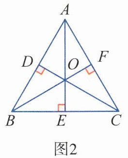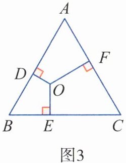 (2)探究:在等边三角形ABC内取一点O,过点O分别作OD⊥AB,OE⊥BC,OF⊥CA,垂足分别为D,E,F。如图2,若O是△ABC三条中线的交点,我们可利用三角形面积公式及等边三角形性质得到两个正确结论(不必证明):结论$1:OD+OE+OF= \frac{\sqrt{3}}{2}a;结论2:AD+BE+CF= \frac{3}{2}a。$如图3,若O是等边三角形ABC内任意一点,则上述结论1,2是否仍然成立?如果成立,请给予证明;如果不成立,请说明理由。
