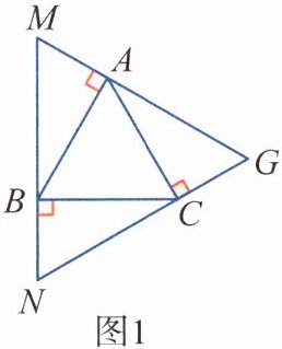 例 已知等边三角形ABC的边长为a。(提示:含30°角的直角三角形的三条边的比为$1:\sqrt{3}:2)(1)$探究:如图1,过等边三角形ABC的顶点A,B,C依次作AB,BC,CA的垂线围成△MNG,求证:△MNG是等边三角形且$MN= \sqrt{3}a。$