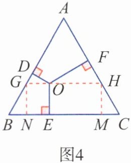 (2)结论1成立。证明:如图4,过点O作GH//BC,分别交AB,AC于点G,H,过点H作HM⊥BC于点M,∴∠DGO= ∠B= 60°,∠OHF= ∠C= 60°。∴△AGH是等边三角形。∴GH= AH。