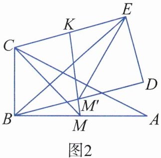 (2)如图2,连结MM'并延长交CE于点K,试判断CK与KE之间的数量关系,并说明理由。