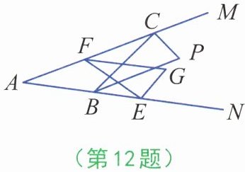 12. 如图,点G是△AFE的两外角平分线的交点,点P是△ABC的两外角平分线的交点,点F,C在AM上,点B,E在AN上,如果∠FGE= 66°,那么∠P= ______。