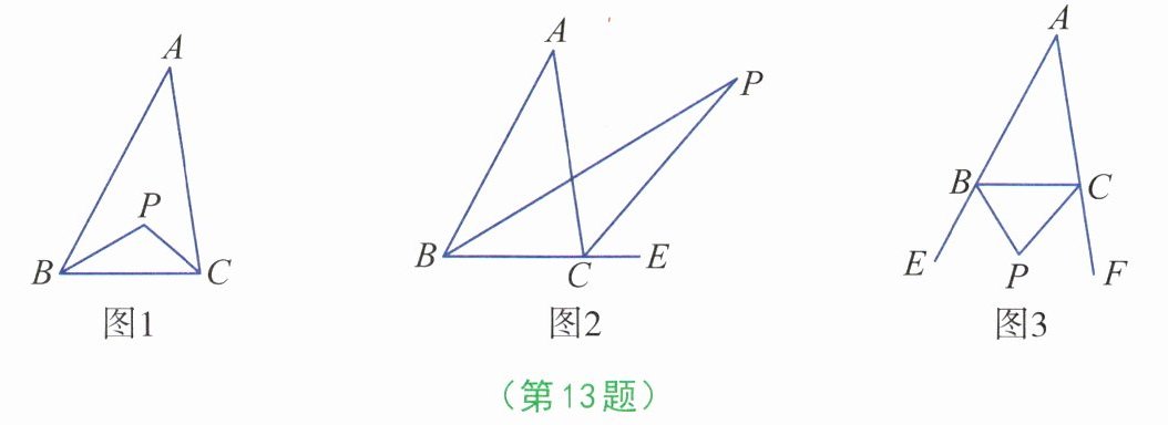 (3)如图3,若两外角∠EBC,∠FCB的平分线交于点P,则∠P= ______,∠A与∠P之间的数量关系是______。