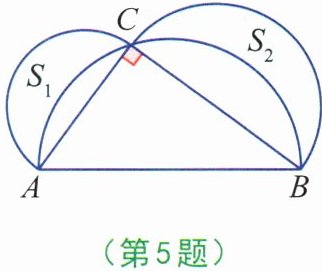 5. 如图,涂色部分表示以直角三角形各边为直径的三个半圆所组成的两个新月形,已知$S_1+S_2= 7$,且$AC+BC= 8$,则AB的长为( )。