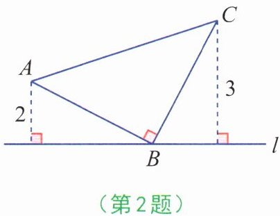 2. 如图,直线l过等腰直角三角形ABC顶点B,A,C两点到直线l的距离分别是2和3,则AB的长是( )。
