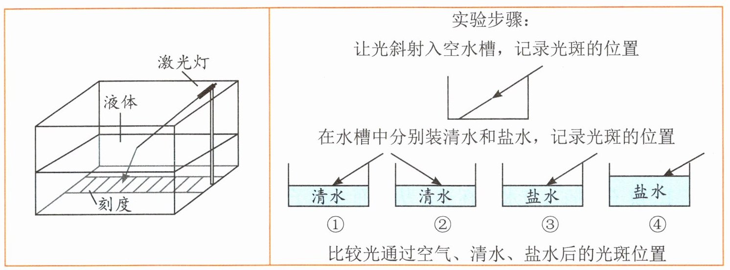 步骤:①让光分别斜射入空水槽、淡糖水、浓糖水中,观察并记录光斑的位置。②比较光通过空气、淡糖水、浓糖水后的光斑位置。