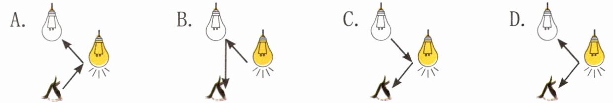 6.(浙江杭州期末)黑暗的房间里有两盏灯,点亮一盏后,能够看到另一盏不亮了,这一现象中光的传播路线最合理的是( )。