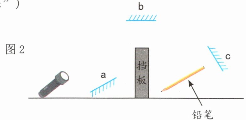3. 小科的铅笔掉到了桌子的挡板后黑暗处。如图2,不改变手电筒和挡板的位置,要照亮黑暗处的铅笔,小科应该将镜子放在图中的______位置。(填“a”“b”或“c”)