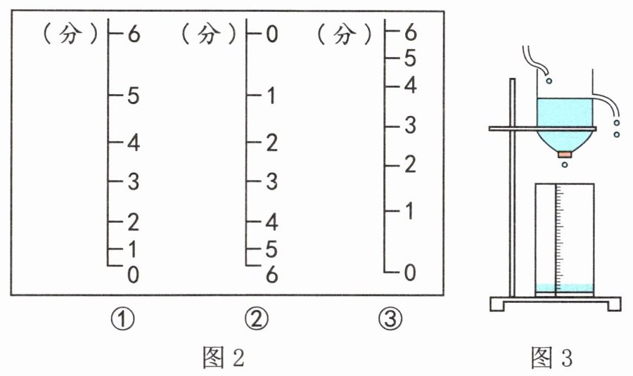 3. 图1是小科组制作的水钟,加满水后自然状态下滴水,滴水的速度是 (填“先快后慢”“先慢后快”或“匀速”)的;在接水容器外壁每分钟画一次刻度,画出的刻度如图2,其中可能正确的是 (填编号①、②或③)。