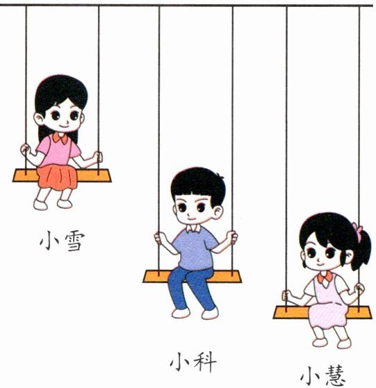 5. 荡秋千是孩子们非常喜欢的一项游艺活动,有单人荡、双人荡、立荡、坐荡等,如图所示,小科、小雪、小慧三位小朋友一起玩荡秋千。一分钟,三位小朋友中 小慧 摆动次数最多, 小雪 摆动次数最少。