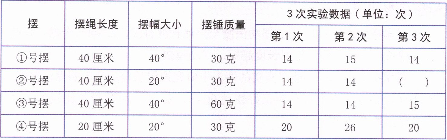 | ②号摆 | 40厘米 | 20° | 30克 | 14 | 14 | ( ) |