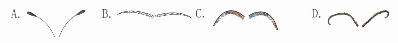 1. 在放大镜下观察,能发现不同昆虫的触角形状不同。下图中属于蝴蝶触角的是( )。
