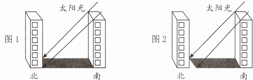 4. 我国在规划城市住宅楼群时,为了保证后排房屋中午能照到太阳,必须考虑前后楼在南北方向上的楼间距,图1是冬季的日影,图2是夏季的日影,你认为楼间距的设计应参考 季的光照情况,你的理由是 。