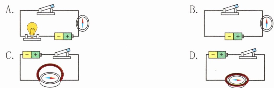 4. 当开关闭合时,下列电路中指南针偏转角度最大的是( )。