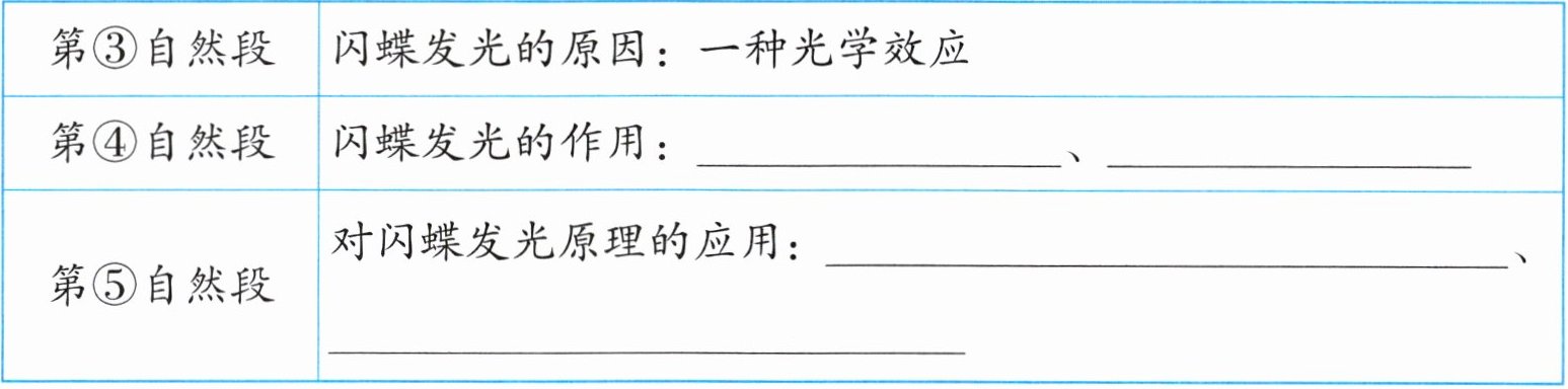 | 第④自然段 | 闪蝶发光的作用:______、______ |