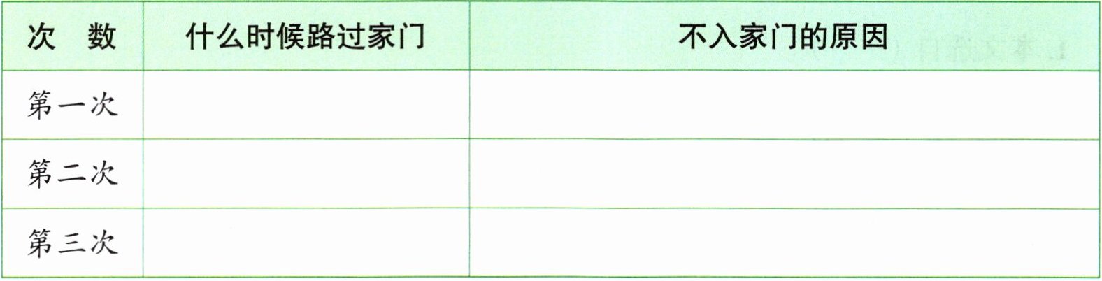 | 次 数 | 什么时候路过家门 | 不入家门的原因 |