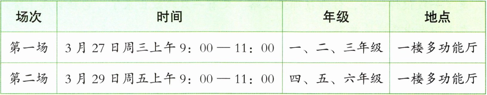 |第一场|3月27日周三上午9:00—11:00|一、二、三年级|一楼多功能厅|