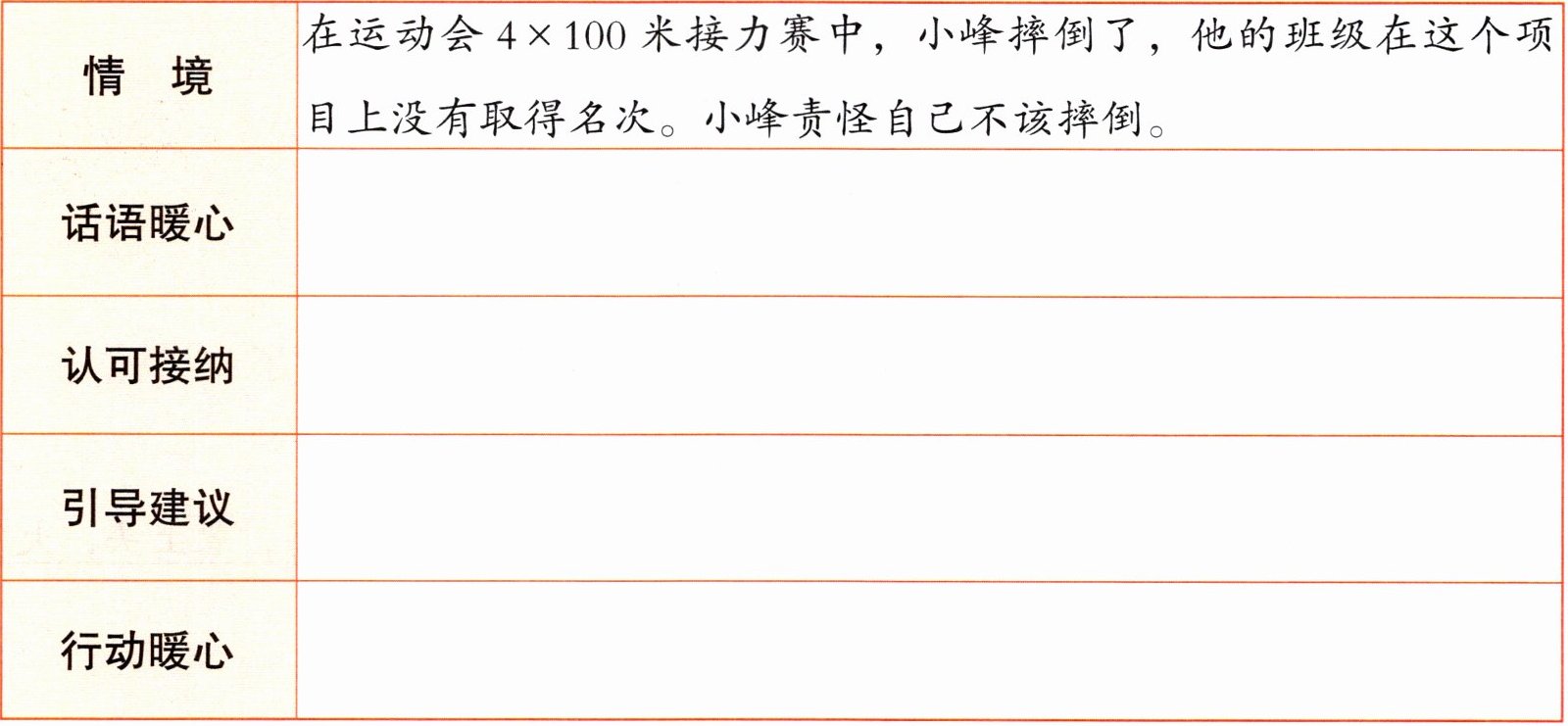 |情境|在运动会4×100米接力赛中,小峰摔倒了,他的班级在这个项目上没有取得名次。小峰责怪自己不该摔倒。|