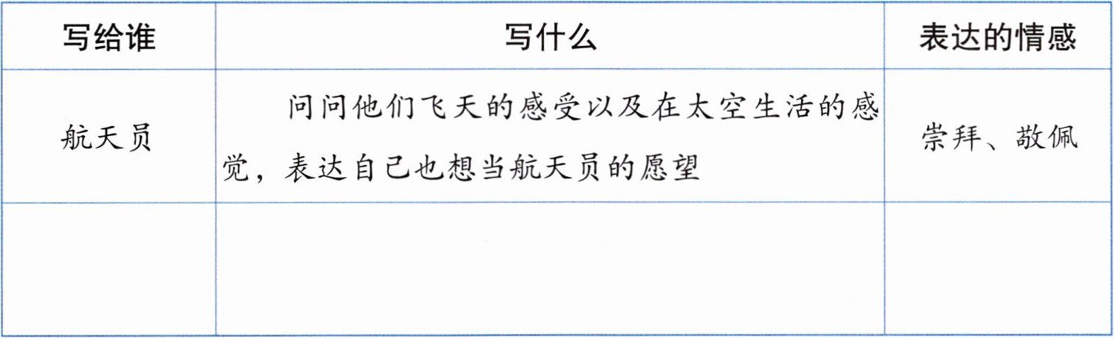 | 航天员 | 问问他们飞天的感受以及在太空生活的感觉,表达自己也想当航天员的愿望 | 崇拜、敬佩 |