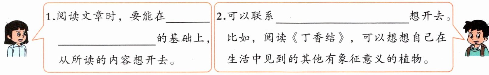 2.可以联系 想开去。比如,阅读《丁香结》,可以想想自己在生活中见到的其他有象征意义的植物。