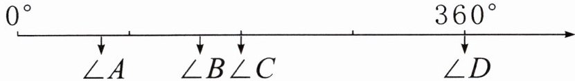 (5)如图所示,从 $0^\circ$ 到 $360^\circ$ 平均分成了4份,各角的大小表示在一条数线上,那么$\angle A$、$\angle B$、$\angle C$、$\angle D$ 对应的角的名称分别是( )。