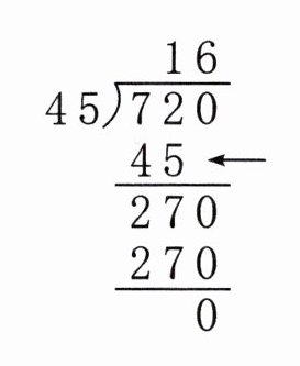 (3)学校买了720本笔记本,每班分45本,可以分给多少个班?小书用竖式计算出了结果(如图)。图中“←”所指的“45”表示的是( )。