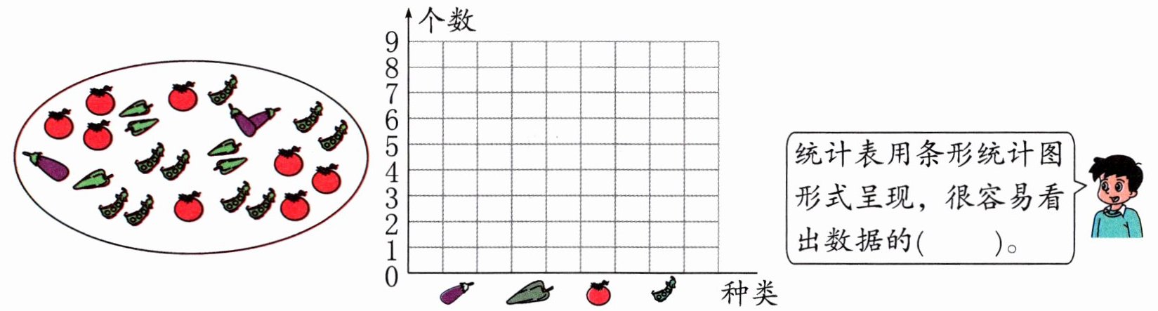 1. 下面是一个蔬菜大拼篮,请完成条形统计图,并回答问题。