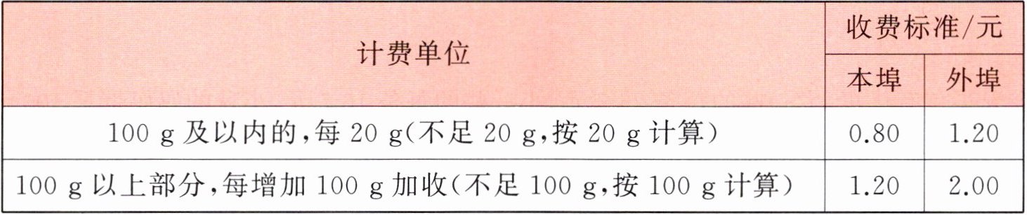 (1)注意本题是“本埠”,按“本埠”的收费标准计算。超过100g的部分有143-100=43(g),按第二段收费标准收费,43g按100g计算,收费1.2元。第一段:先求100g里面有几个20g,即100÷20=5,那么应收费0.8×5=4(元)。总共应收费4+1.2=5.2(元),列综合算式为0.8×5+1.2=5.2(元)。