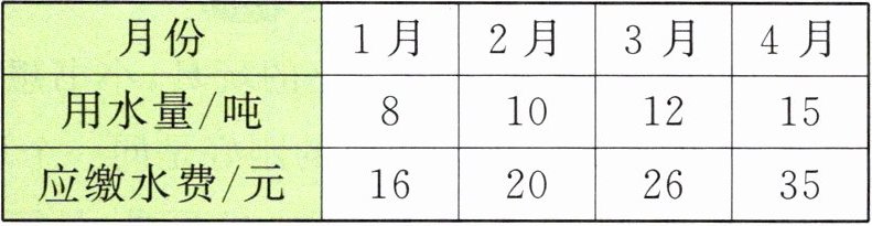 8.[拓展题]某市自来水公司采取按月分段计费的方法收取水费,用水量在规定吨数及以内的按基本标准收费,超过规定吨数部分的标准是每吨收费。小书家1~4月份的用水量和缴纳水费情况如下表,根据表中提供的信息,回答下面的问题。
