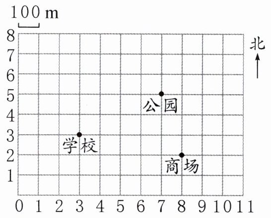(1)学校在(3,3)处。从学校往东走500 m,再往南走100 m处是商场,具体位置是(8,2)。你能像这样描述公园在学校的什么方向及具体位置吗?