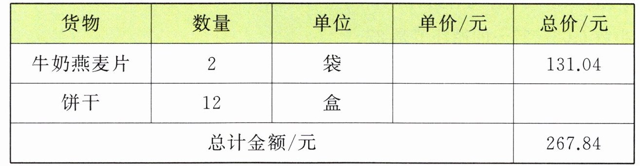 牛奶燕麦片单价:65.52;饼干单价:11.4,总价:136.8;总计金额:267.84