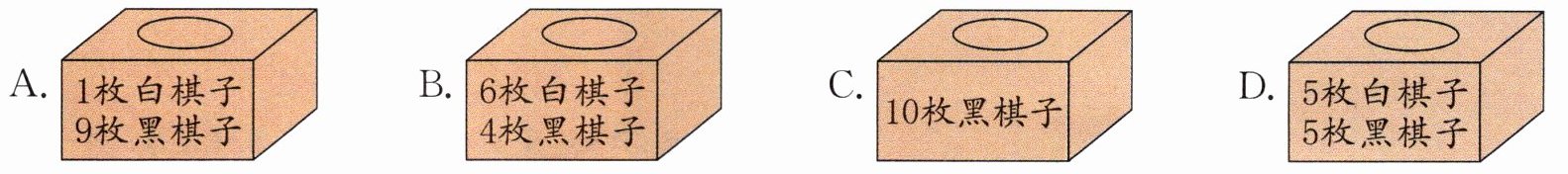 (3)有4个盒子,每个盒子中都有10枚棋子(除颜色不同外,其余均相同)。如果从每个盒子中任意摸出一枚棋子,那么摸到白棋子的可能性最小的是( )。