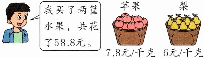 解析 根据等量关系“6千克苹果的总价+梨的总价=总花费58.8元”列出方程并求解。
