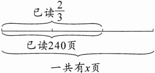 解析:根据图中信息可知,已读页数是总页数的$\frac{2}{3}$,可以列出等量关系式:总页数×$\frac{2}{3}$ = 已读的页数。设一共有x页,然后根据等量关系列方程并解答。