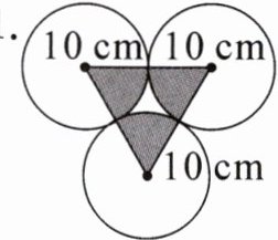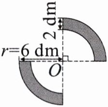 1.3.14×10²×$\frac{1}{2}$=157(cm²) 2.6−2=4(dm) 3.14×(6²−4²)×$\frac{1}{2}$=31.4(dm²) 解析1.三个圆心连接成一个三角形,三角形内角和为180°,三个圆心角之和为180°,它们可以拼成一个圆心角是180°的扇形,也就是半圆,所以阴影部分的面积是3.14×10²×$\frac{1}{2}$=157(cm²)。 2.阴影部分是2个圆心角是90°的扇环,可以拼成圆环的一半,外半径是6dm,环宽是2dm,则内半径是6−2=4(dm),所以阴影部分的面积是3.14×(6²−4²)×$\frac{1}{2}$=31.4(dm²)。