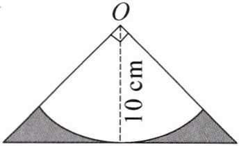 10×10÷2×2−3.14×10²×$\frac{1}{4}$=21.5(cm²) 解析观察题图发现,阴影部分的面积等于大等腰直角三角形的面积减去圆心角为90°的扇形的面积。题中等腰直角三角形可以分割成两个小直角三角形,虚线表示大等腰直角三角形的高,因为大等腰直角三角形两底角是45°,所以两个小直角三角形也是等腰直角三角形,小三角形的两条直角边等于扇形的半径,大三角形的面积是10×10 ÷2×2=100(cm²)。圆心角是90°的扇形的面积等于所在圆的面积的$\frac{1}{4}$,即3.14×10²×$\frac{1}{4}$=78.5(cm²),所以阴影部分的面积是100−78.5 =21.5(cm²)。