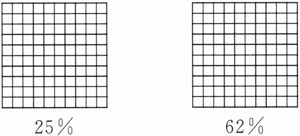 (答案均不唯一)解析: 数出各图中都有100个小方格,要表示25%和62%,只要分别涂25格和62格即可,涂色的图案不唯一。