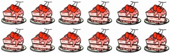 五、妈妈做了12块蛋糕,本来计划全家每人4块,可是因为来了几位客人,现在每人分到2块,一共来了几位客人?圈一圈,算一算。