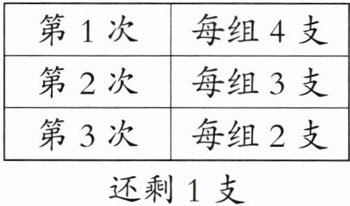 三、李老师把铅笔平均分给 2 个小组,下表是分铅笔的记录,一共有多少支铅笔?