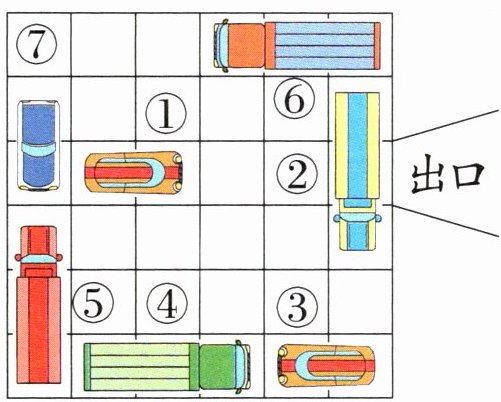 先将⑦号车倒退( )格,再将( )号车( )( )格,再将( )号车( )( )格,然后将( )号车( )( )格,最后将( )号车( )( )格,①号车才能开出出口。