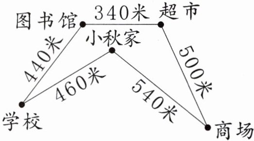 从学校到商场有2条路。“学校→小秋家→商场”这条路最近。最近的路长1000米。