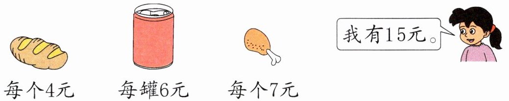 15-2×7 买 2 个面包和 1 个鸡腿,应付多少元?
