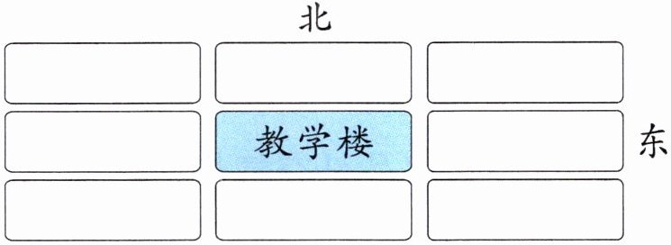 2. 请把“食堂”“综合楼”“篮球场”安排在第1题方向板中你认为合适的位置上,并说说它们分别在教学楼的什么方向。