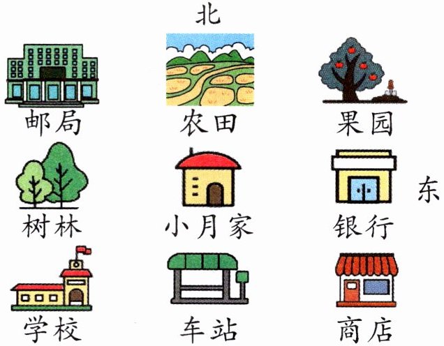 3. 小月家在果园的( )方向,在商店的( )方向。